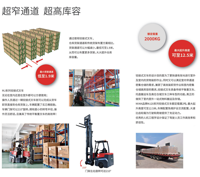 ?超窄巷道作業(yè),通道寬度可達2M大角度門架擺角設計(擺頭角度可達210度)更大程度減小通道寬度,提高庫容量;