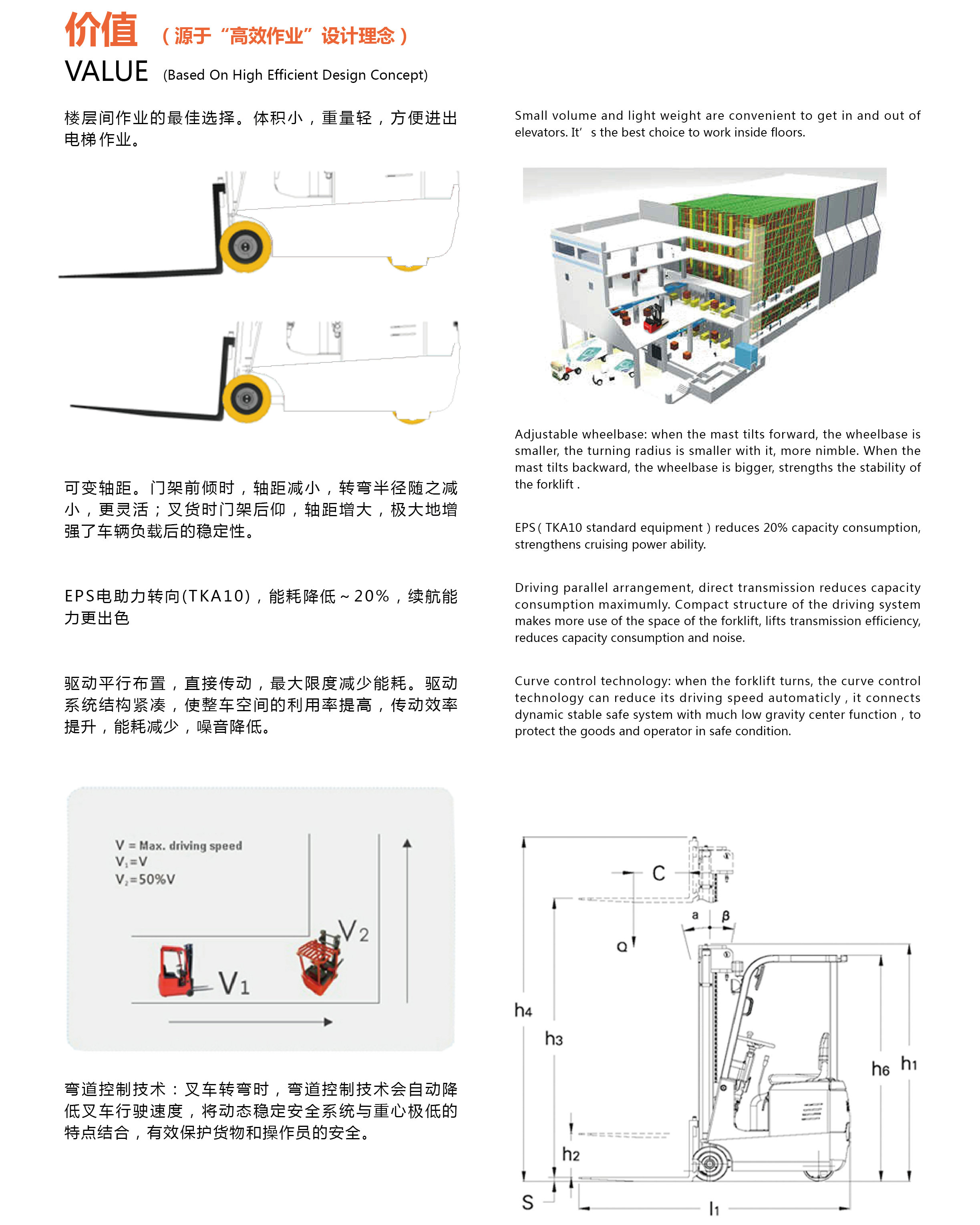 Ø1.5噸車型,自重僅為1980Kg,門架閉合高度僅為1995mm,套筒式可調(diào)鍛造貨叉,極其適用于樓層作業(yè)。